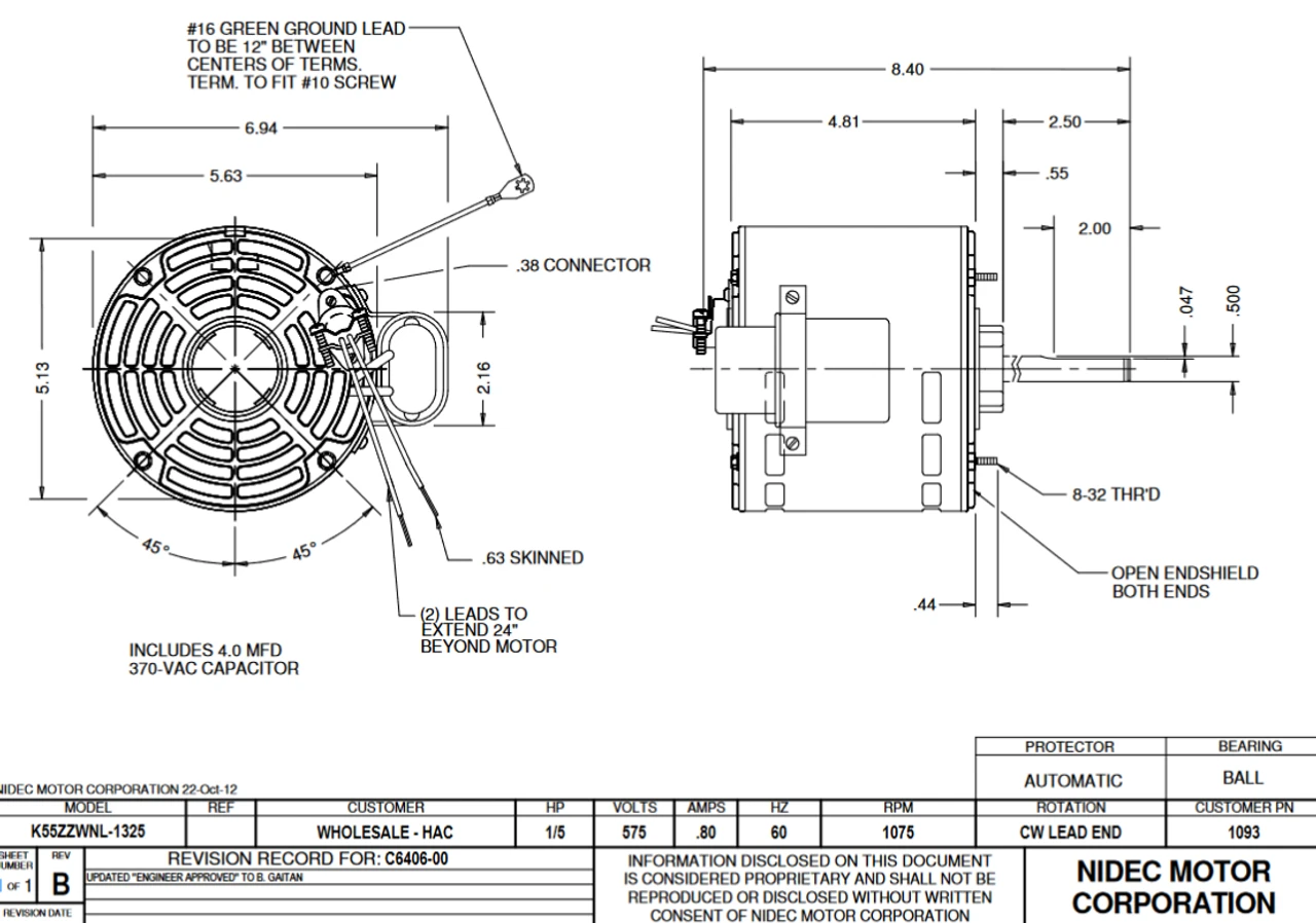 - 1/5 hp 1075 RPM, 0.8 amps 575V Volts 60 Hz PSC Motor