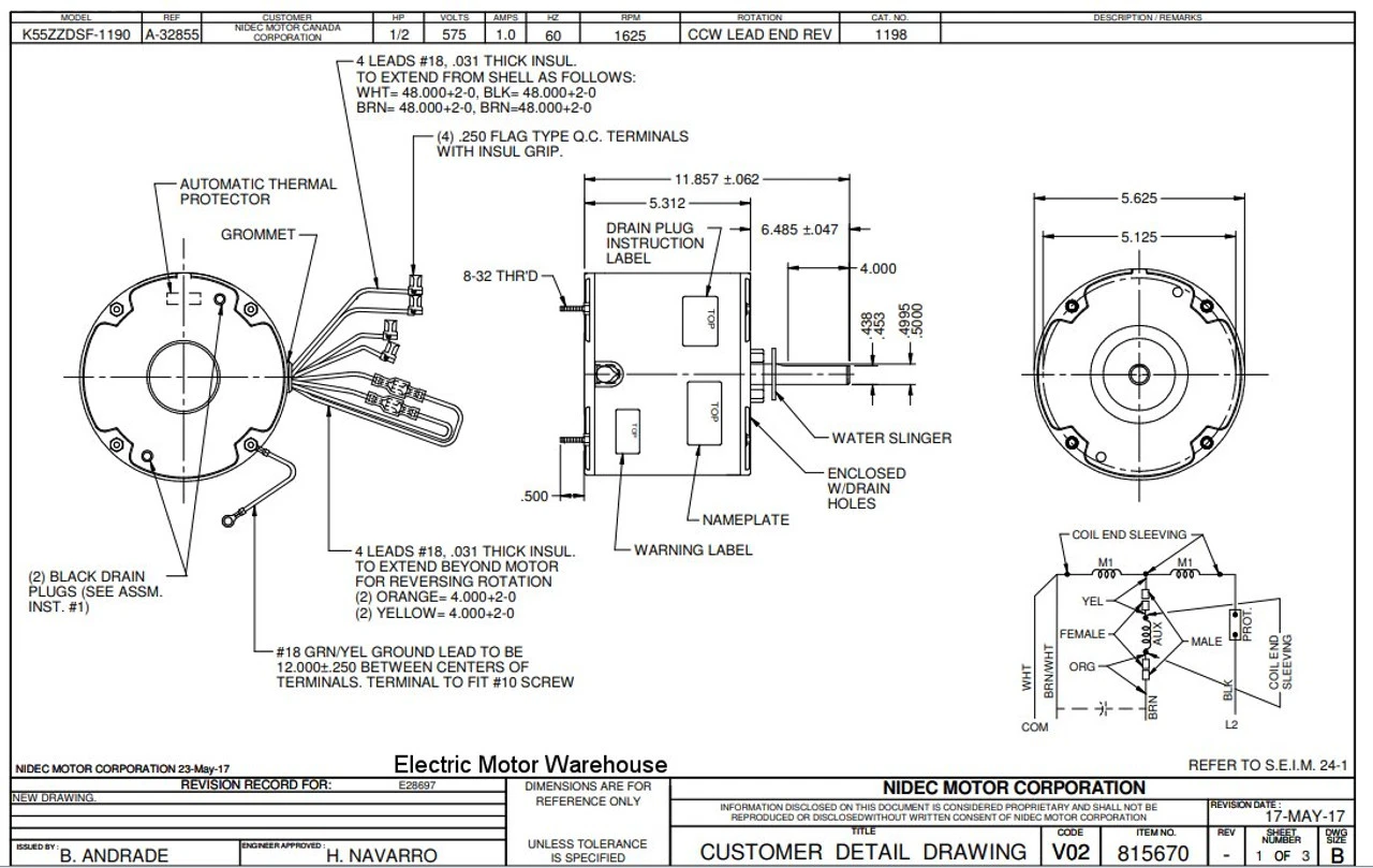 Permanent Split Capacitor Motor. Automatic Overload Protection. Continuous Duty; Totally Enclosed Air Over Enclosure; Class B Insulation; 50C Ambient Temperature; 30″ Leads, K055DSF1190015B