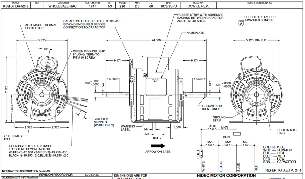 Direct Drive Fan Motor for central HVAC systems. Wiring diagram on motor name plate. OAO = Open Air-Over, KD55HSR5249R11B