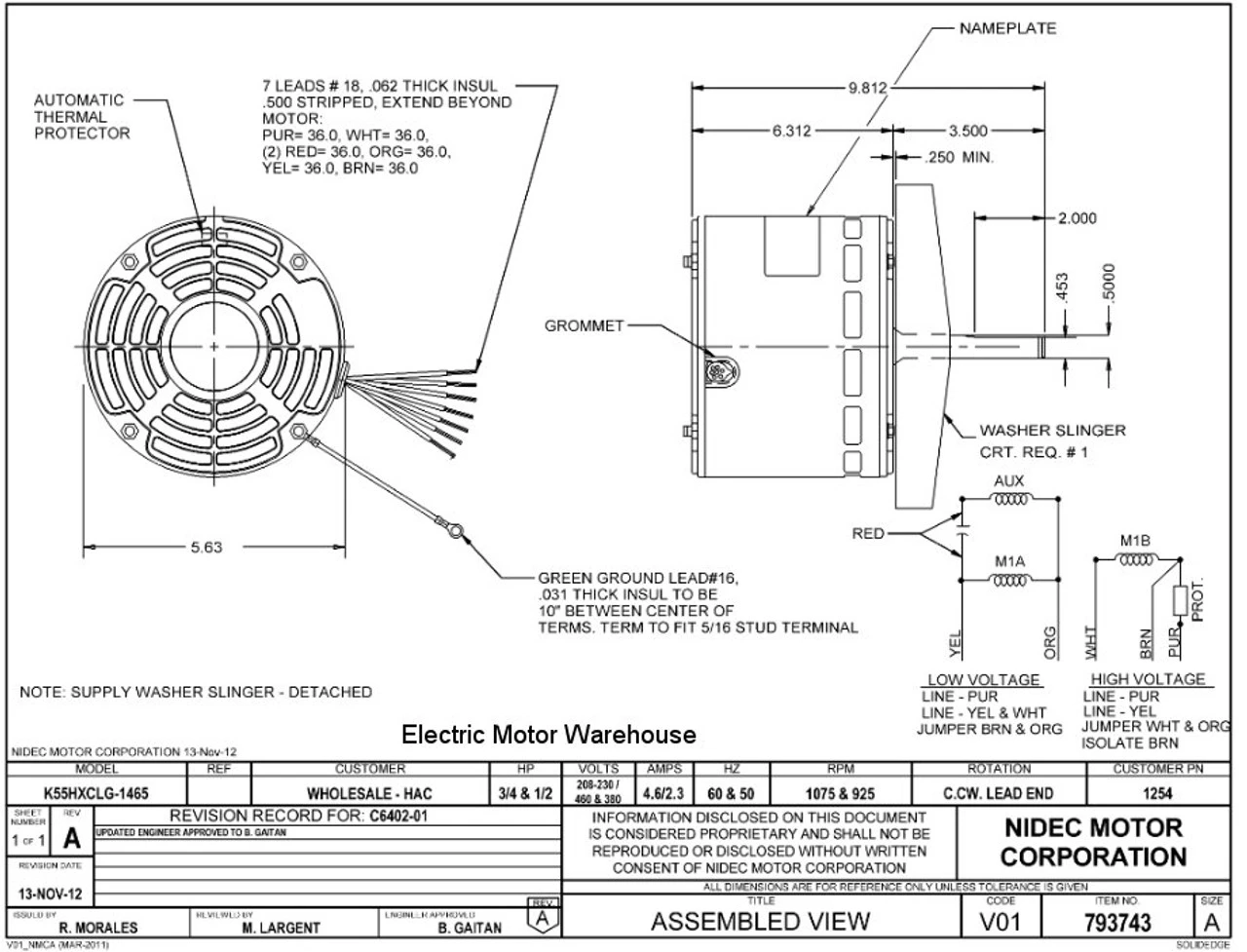 1254 Nidec | 3/4 Hp 1075 RPM 1-Speed 208-230, 380, 460V; 5.6″ Condenser Motor