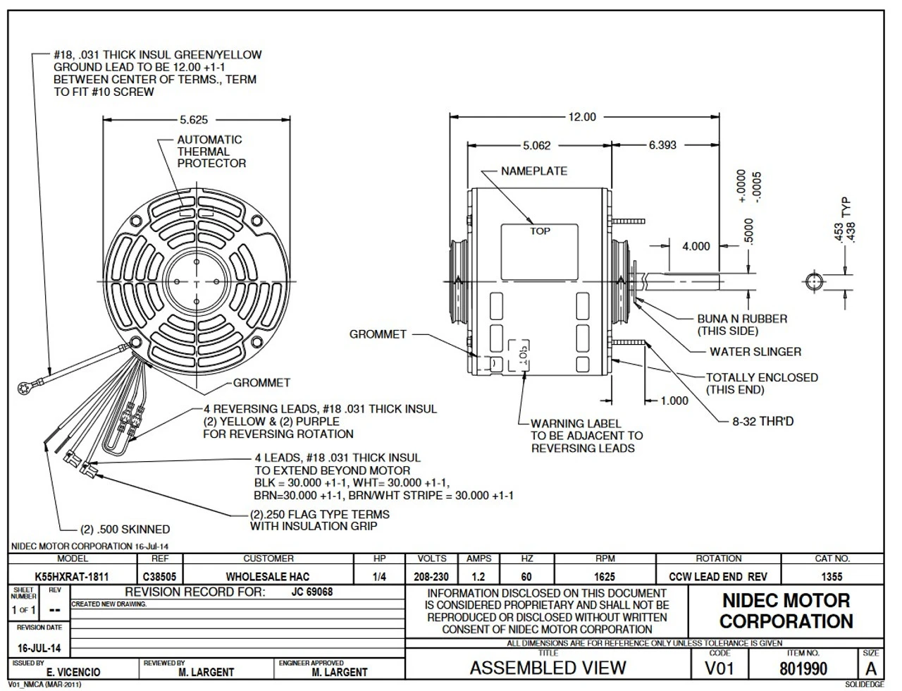 1355 Nidec | 1/4 Hp 1625 RPM 1-Speed 208-230V; 5.6″ Condenser Motor