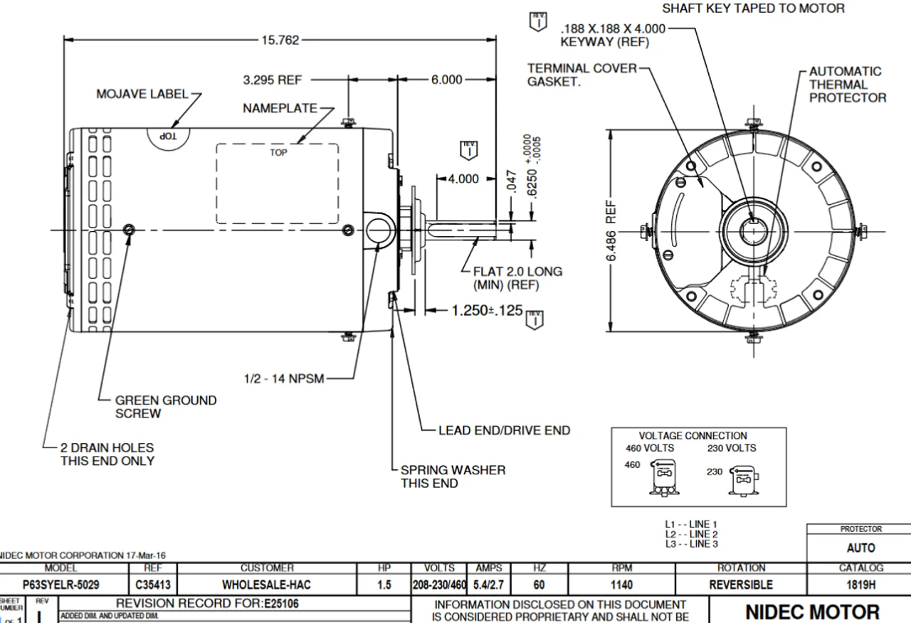 1819H Nidec 1 1/2 Hp 1140 RPM 208-230/460V 56Z Frame (No Base) 1-Speed OAO 3-Phase Commercial Motor
