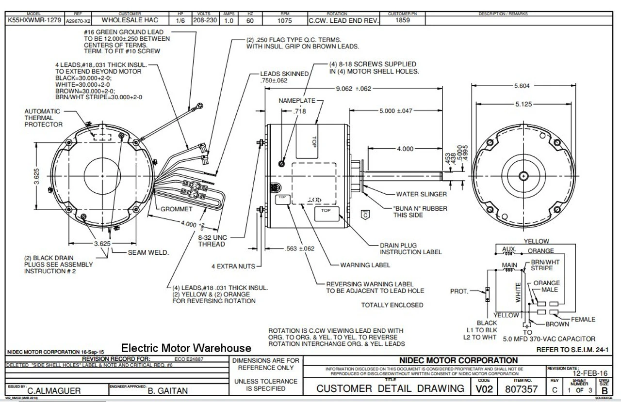 Permanent Split Capacitor Motor. Automatic Overload Protection. Continuous Duty; Totally Enclosed Air Over Enclosure; Class B Insulation; 60C Ambient Temperature; 30″ Leads, K055WMR1279012B
