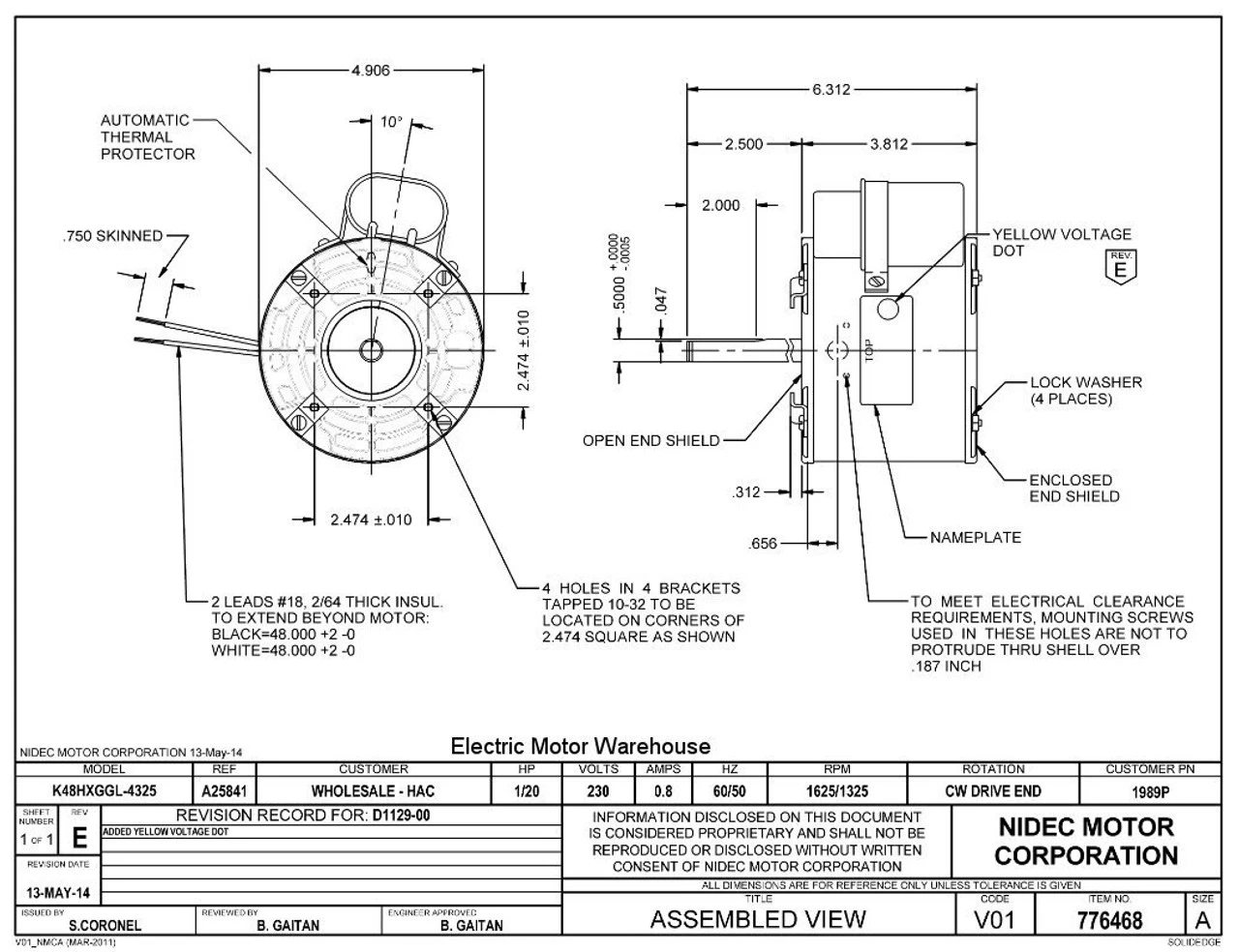 Permanent Split Capacitor Motor. Automatic Overload Protection. Continuous Duty; Open Enclosure; Class B Insulation; 40C Ambient Temperature; 48″ Leads. Application: Heat Pump, Furnace. K048GGL4325011B Suggested after market replacement for Copeland condenser motor 050-0167-002, F48BGP1092, 5KSP29BG5012S, 5KSP21DG2162, S81-171, S88-507, MOT06285