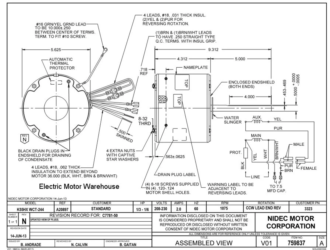 Permanent Split Capacitor Motor. Automatic Overload Protection. Continuous Duty; Totally Enclosed Air Over Enclosure; Class B Insulation; 60C Ambient Temperature; 30″ Leads, K055WCT0244012B