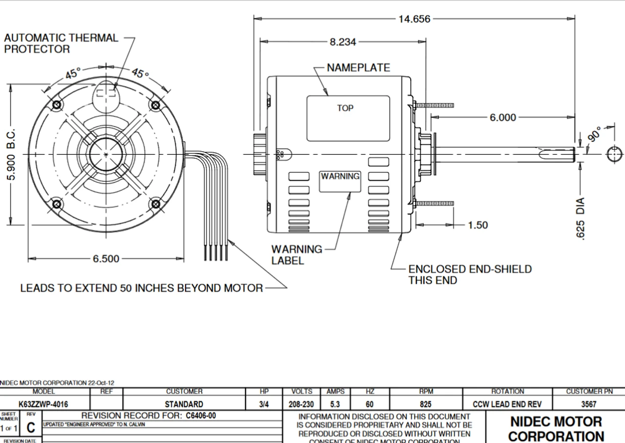 - 3/4 hp 825 RPM, 5.3 amps 208-230V Volts 60 Hz PSC Motor