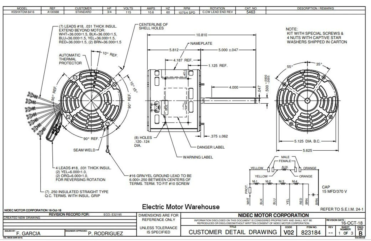 Permanent Split Capacitor Motor. Automatic Overload Protection. Continuous Duty; Open Enclosure; Air Over; Class B Insulation; 40C Ambient Temperature; 36″ Leads. Application: Furnace blower motor. Includes 2.25″ Dia. hub rings with kit for 2.5″ included. Suggested after market replacement for Rheem K055TDM8416012B., K55HXPAD4962, 51-22700-01, 51-23017-42, K55WDRJ7033, HQ1010263EM, 5452
