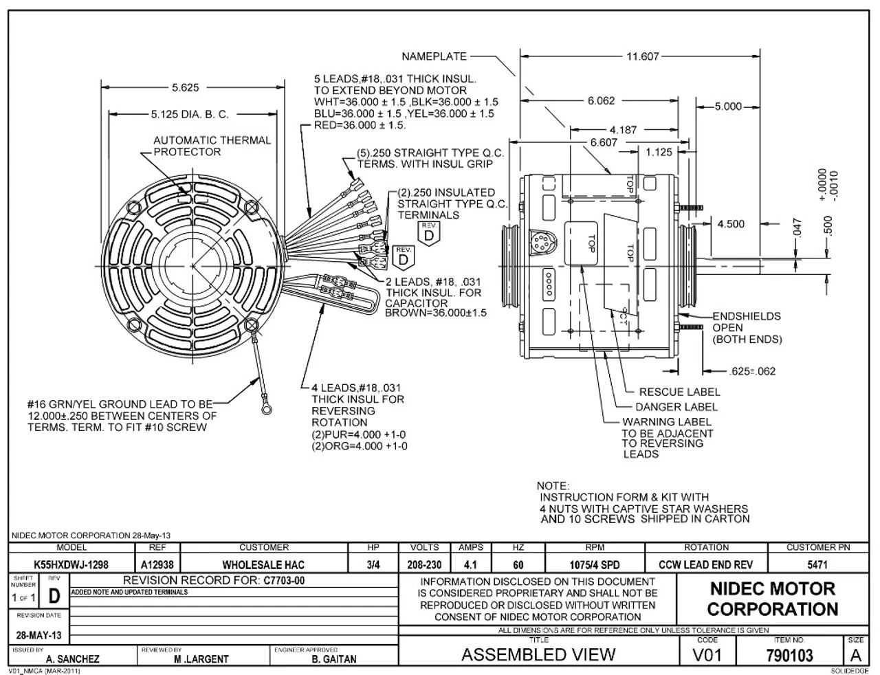 Permanent Split Capacitor Motor. Automatic Overload Protection. Continuous Duty; Open Air Over Enclosure; Class B Insulation; 40C Ambient Temperature; 36″ Leads, 60 Hertz. K055DWJ1298012B. Century D1076, Fasco D729
