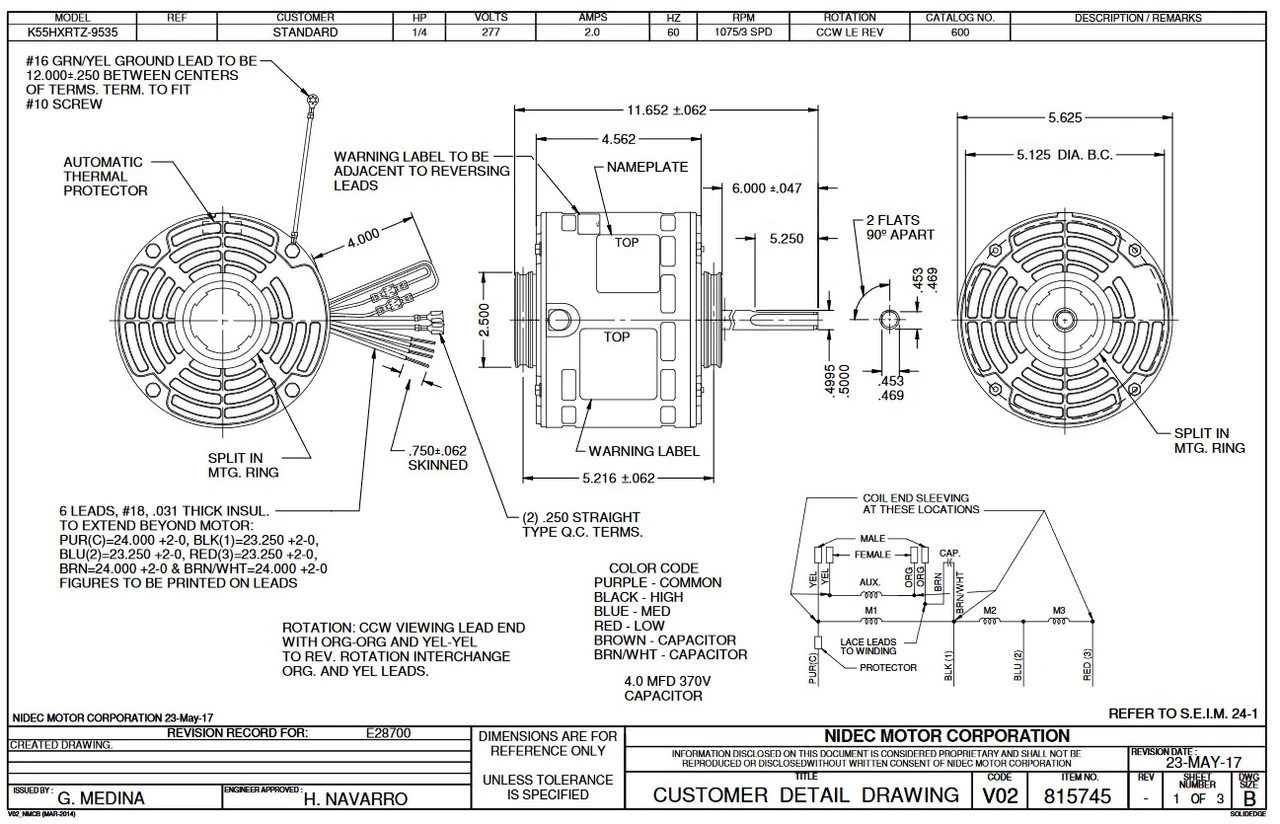 600 Nidec | 1/4 Hp 1075 RPM 3-Speed 277V; 5.6″ Blower Motor