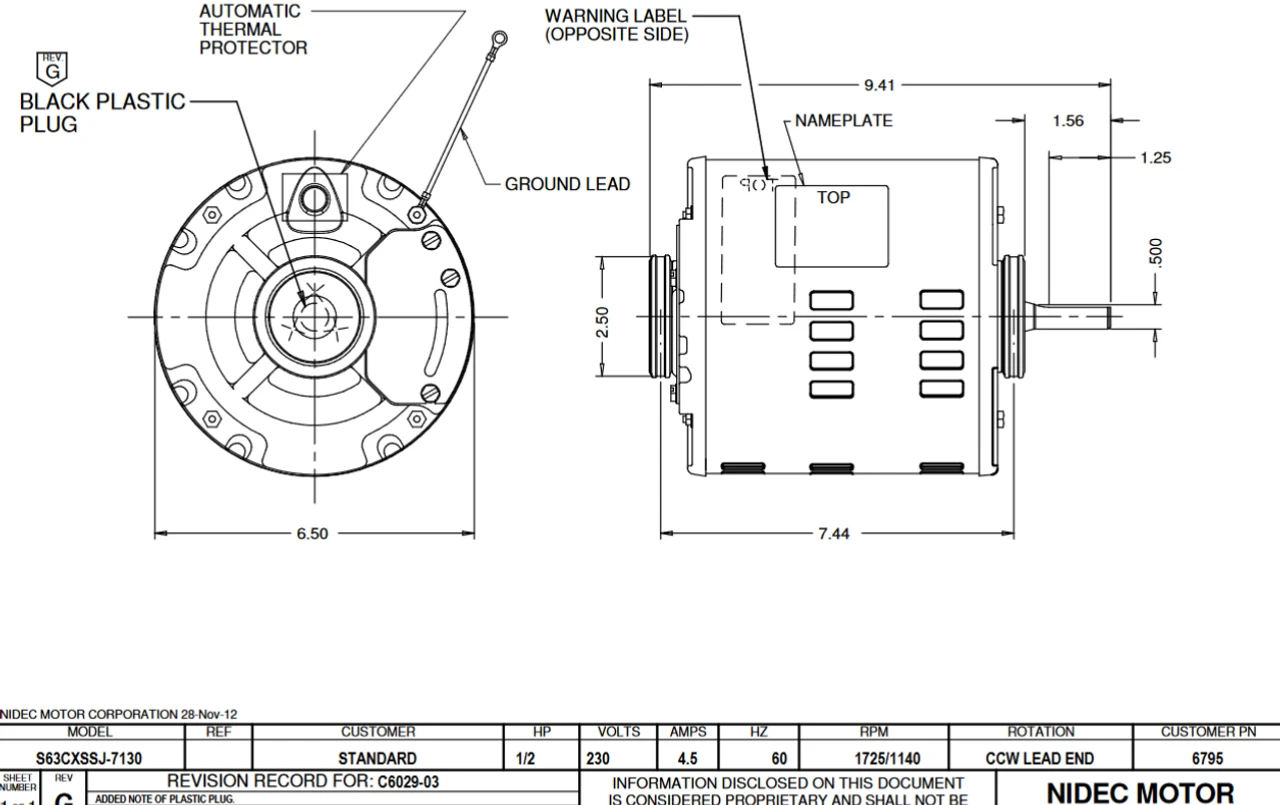 - 1/2 hp 1800/1200 RPM (2 speed), 4.5 amps 230V Volts 60 Hz Split Phase Motor