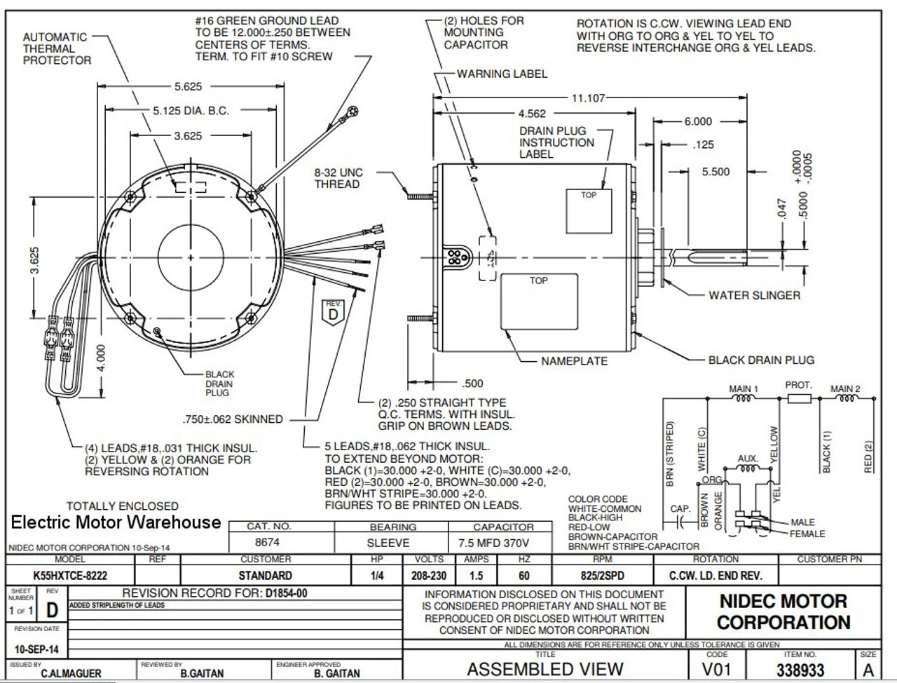 Permanent Split Capacitor Motor. Automatic Overload Protection. Continuous Duty; Totally Enclosed Air Over Enclosure; Class B Insulation; 60C Ambient Temperature; 30″ Leads, K055TCE8222012B